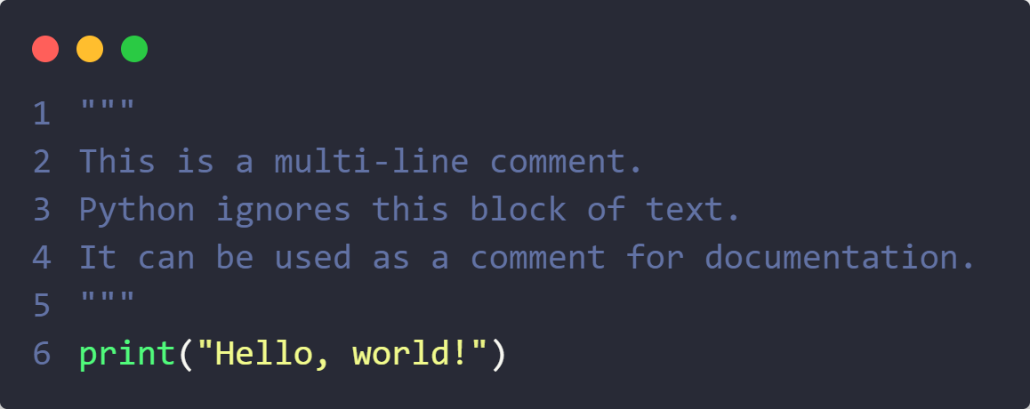 Another way to write multi-line comments is by using triple quotes """ or '''). Technically, these are multi-line strings, but when not assigned to a variable, Python ignores them.