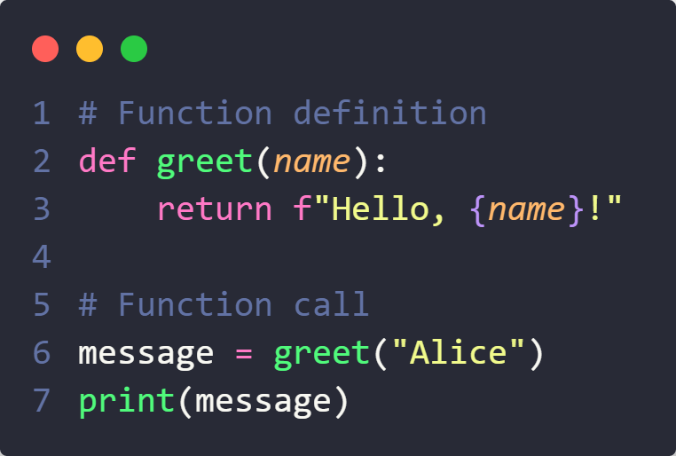 Functions allow you to group reusable code. Define a function using the def keyword: