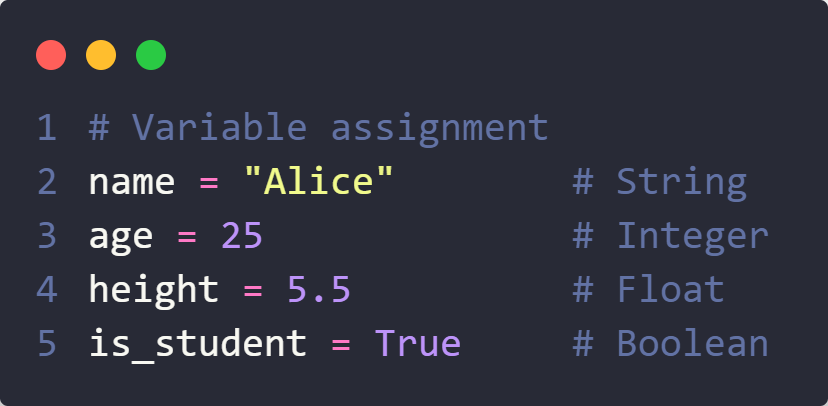 In Python, variables don't need to be explicitly declaredโtheyโre created when you assign a value. Python automatically identifies the data type: